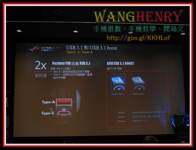 而這次在ROG系列的電競主機板上採用了TYPE-A跟TYPE-C的混搭USB3.1的設計,Henry覺得不全數採用新的TYPE-C最主要原因還是普及性囉。